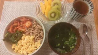 ベーコンエッグ、ほうれん草のおひたし、納豆、ピクルス、白米、白菜とエノキと長ネギとお豆腐のお味噌汁
