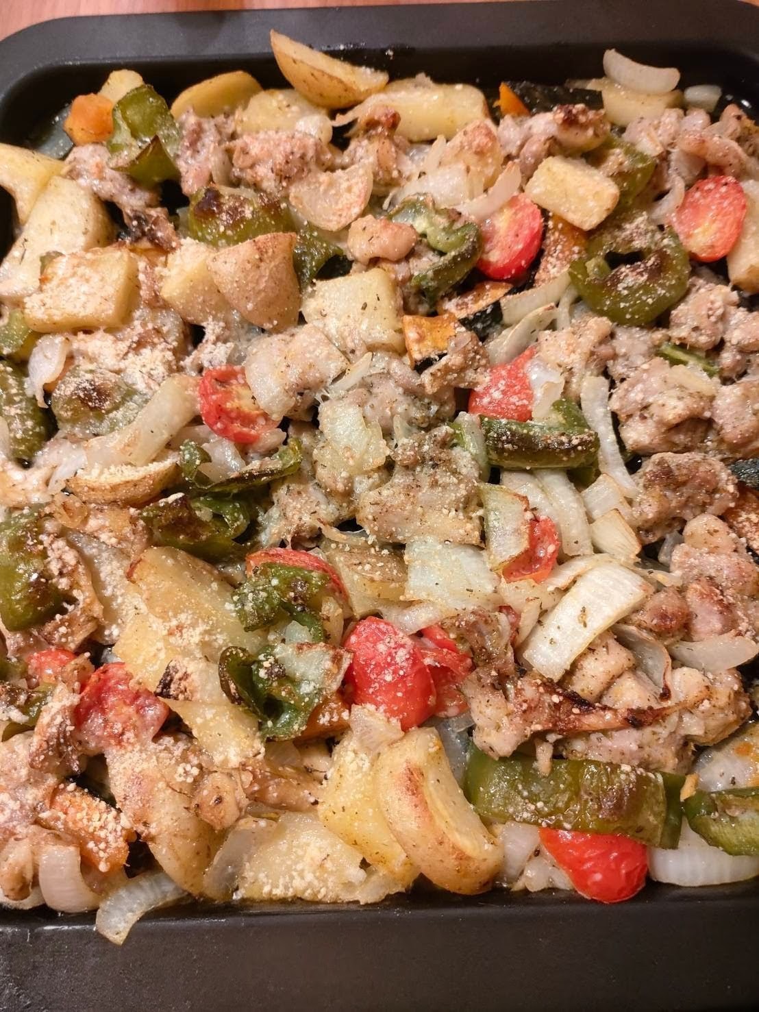 今回は鶏モモ肉、玉ねぎ、カボチャ、舞茸、ピーマン、ミニトマト、ジャガイモ