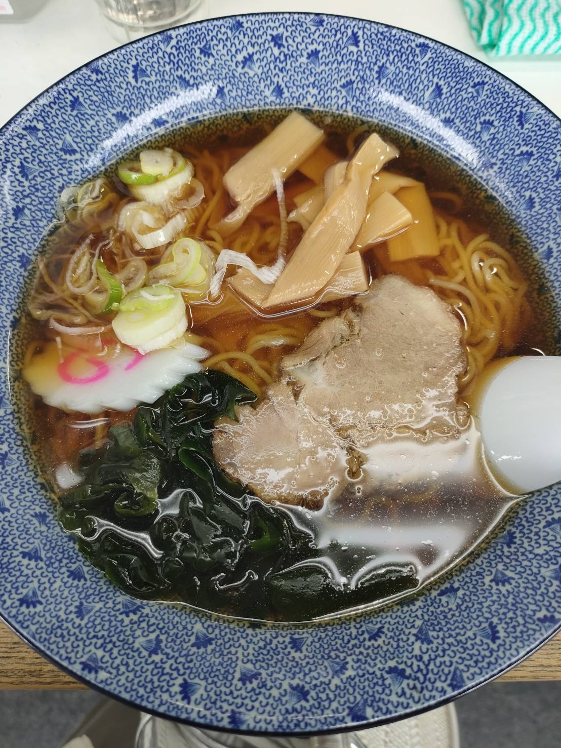 このご時世600円なのに たっぷりワカメ、長ネギ、メンマ、柔らかチャーシュー、そして1番好きなナルト 素晴らしい布陣です