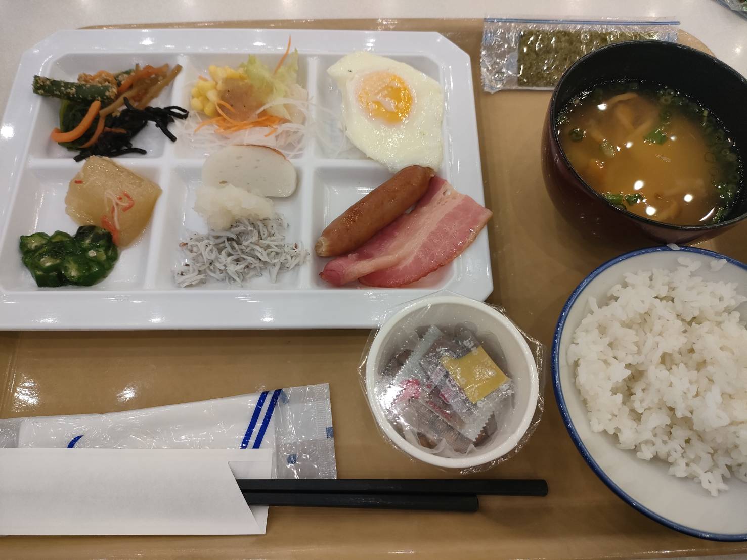 ご飯、お味噌汁、納豆、海苔、ソーセージ、ベーコン、目玉焼き、シラス大根おろし、蒲鉾、サラダ、オクラ、大根煮物、小松菜おひたし