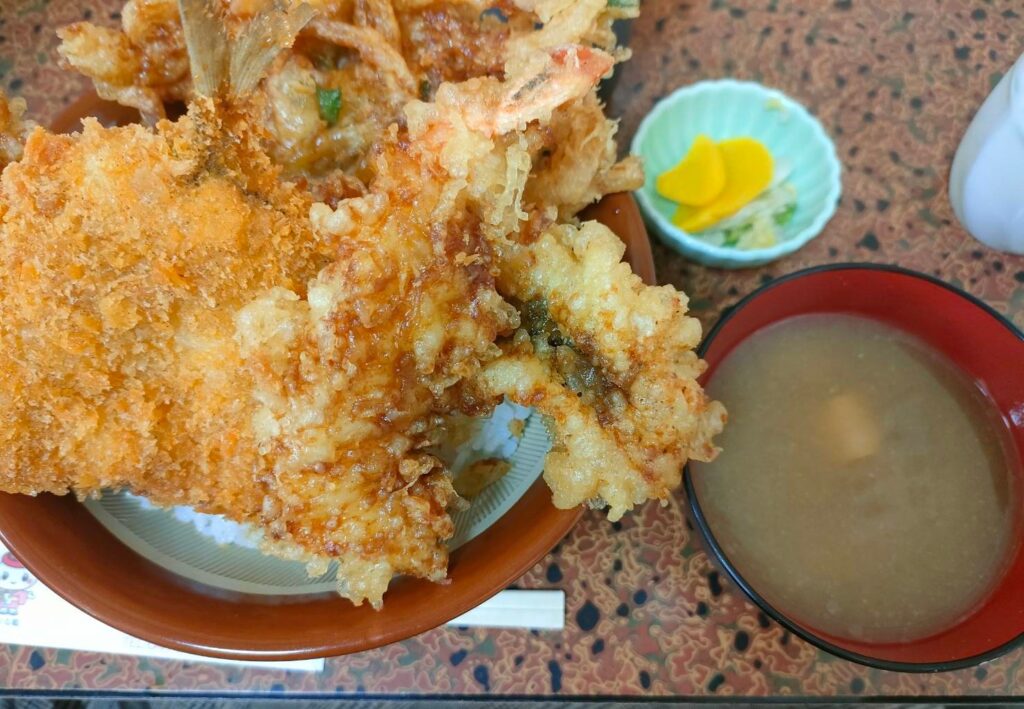 鯵フライ、穴子の天ぷらとかき揚げの天ぷらは丼からはみ出しています