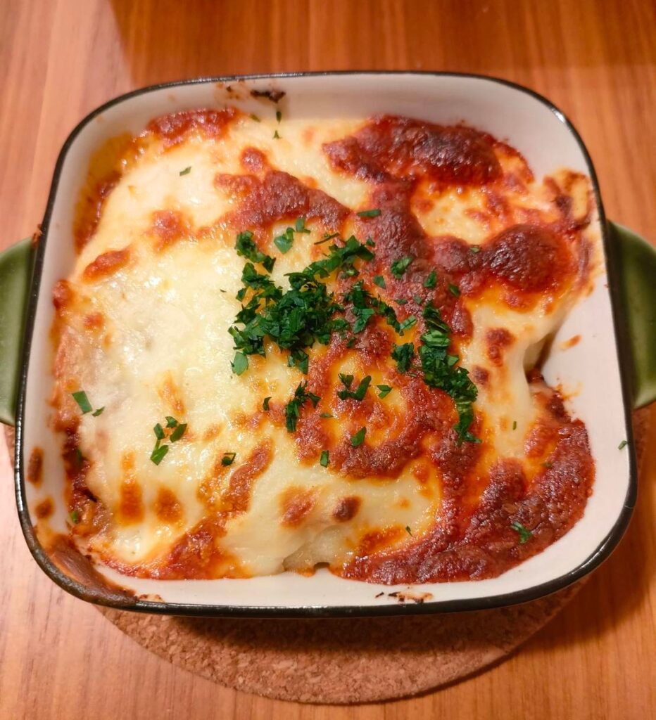 ジャガイモを一口大に切ってレンチンしてから薄切りにした玉ねぎとバターソテーしグラタン皿に敷き、その上にレトルトハンバーグリメイクのミートソース、ホワイトソース、チーズを順に乗せてオーブンで焼きました