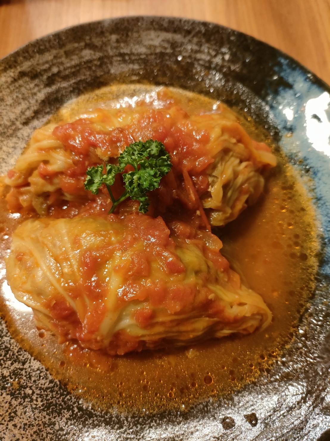 ハンバーグ種をシナっとするくらいに茹でたキャベツで包み、水、トマト水煮缶、コンソメ、砂糖、酒、味醂でコトコト煮ます