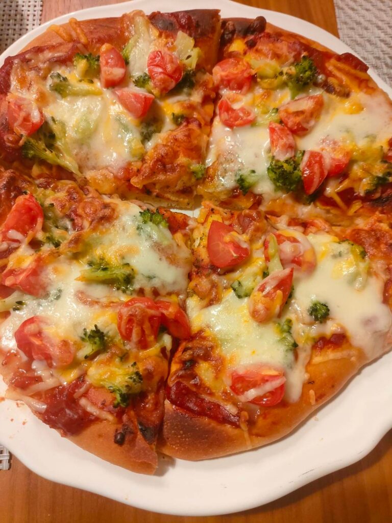 ピザソース、ブロッコリー、ミニトマト、モッツァレラチーズ、ピザチーズを加えてオーブンで焼きました