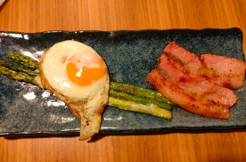 アスパラガスソテー、目玉焼き、ベーコン