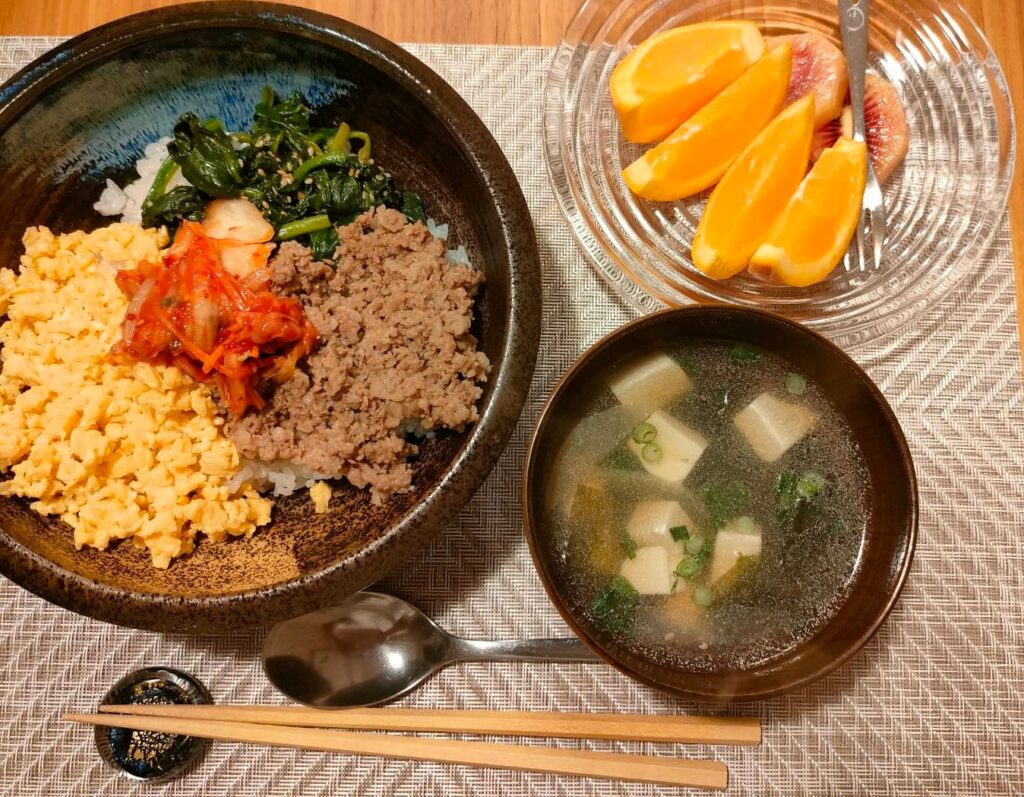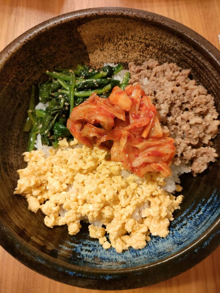 合挽き肉と卵のそぼろ、ほうれん草のナムル、キムチ、ご飯を多めで