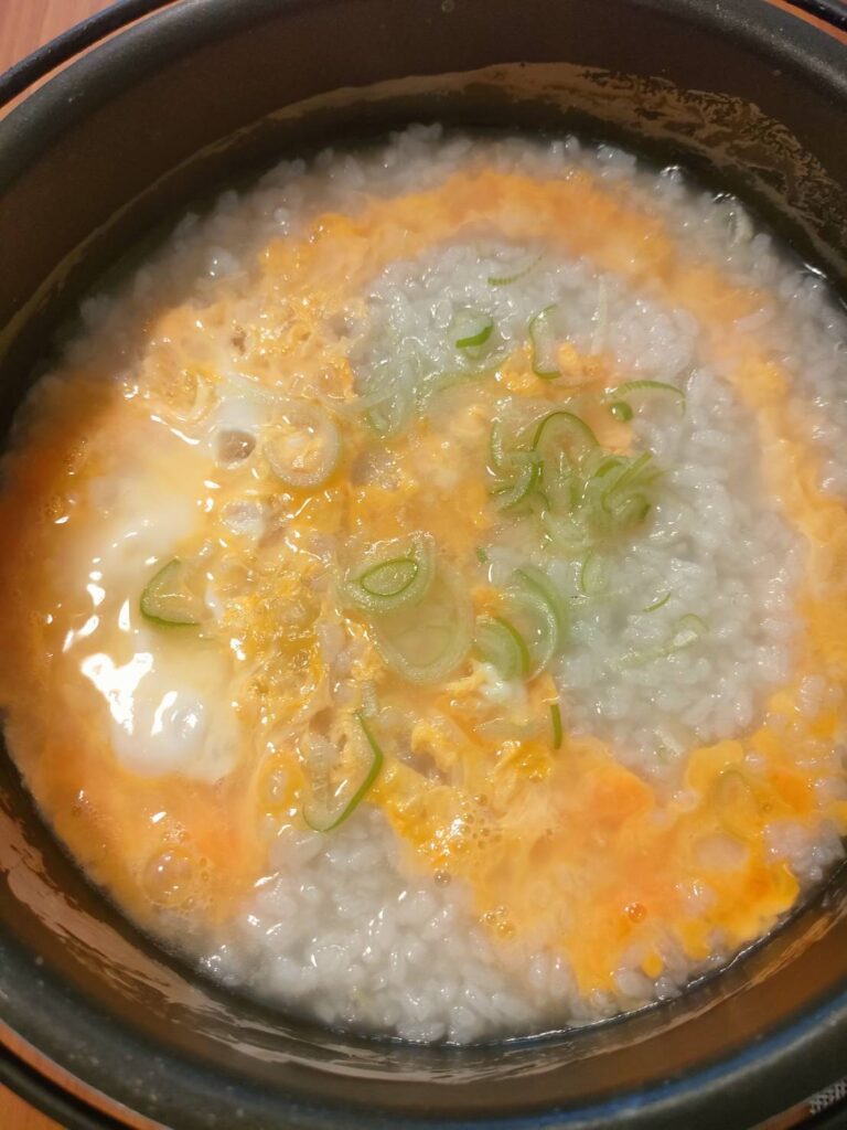 お水にご飯を入れて5分程煮てから白出汁を入れて2〜3分煮、塩で味を整えてから溶き卵を回しかけます