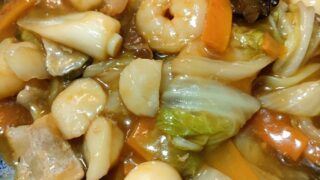 上記と同量の浸し液に醤油と砂糖を小さじ1ずつプラスして煮立たせた中に大根おろしとおろし生姜・干しエビを加え味見をして味を調えて盛り付けの際にかけています