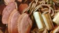 お豆腐を置いてスープを入れてから周りに豚肉、アサリ、ニラ、長ネギ、エノキ、椎茸、ホタテを入れてから卵を割り入れて火を入れます